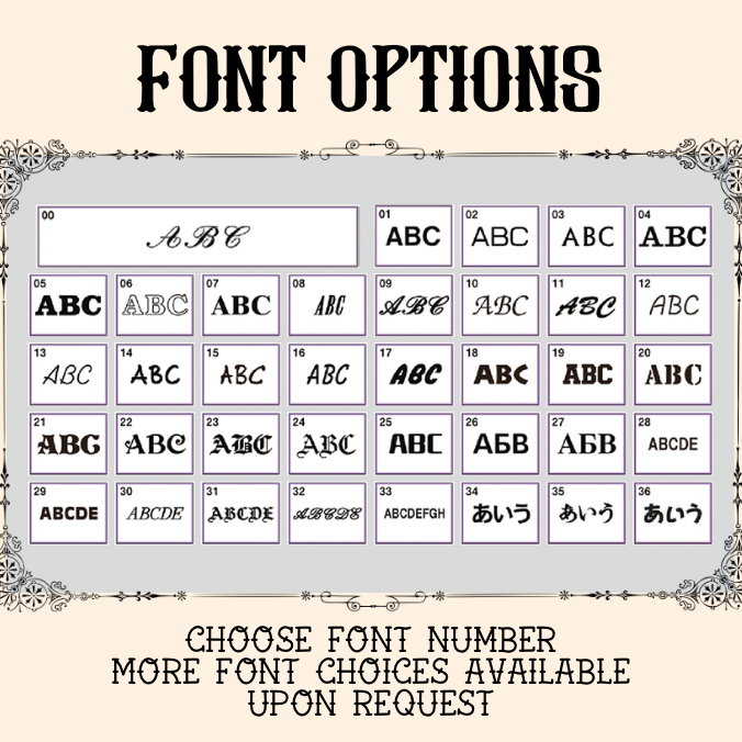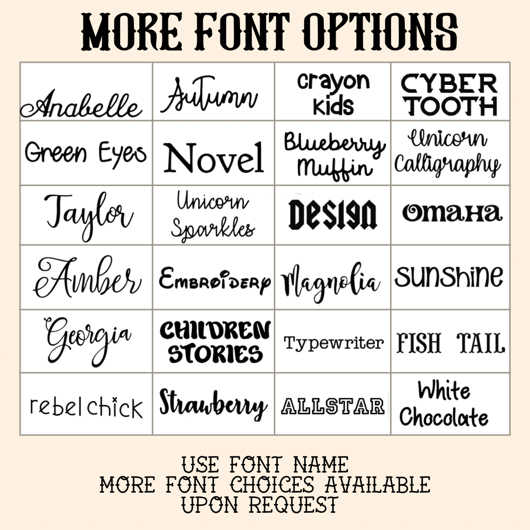 Use the contact box below to enter the name and dates you want embroidered. Also enter your preferred font and thread colour (these will be used on all the embroidered gifts; see image for options)
