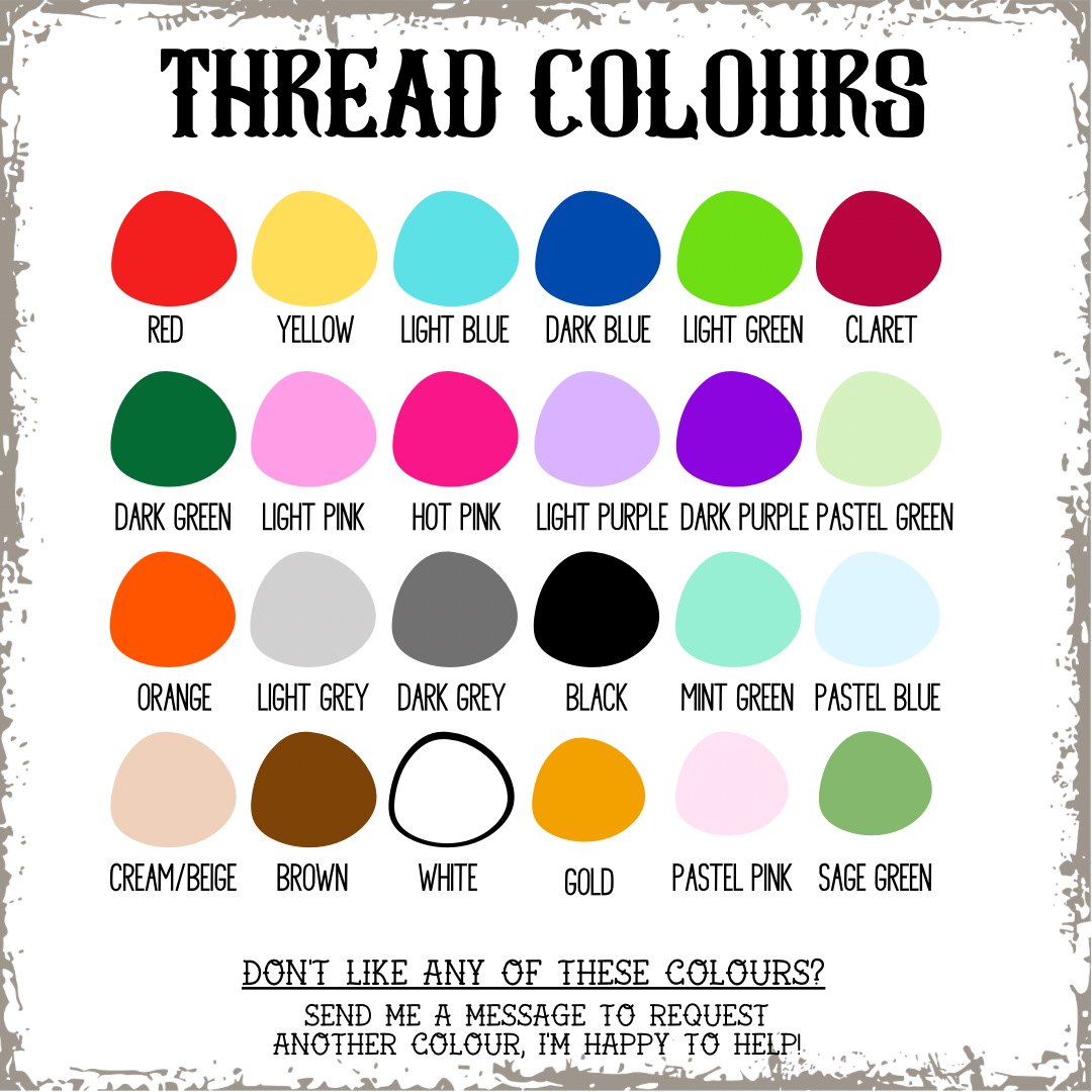 Use the contact box below to enter the name you would like embroidered along with font and thread colour choice (see images for options)