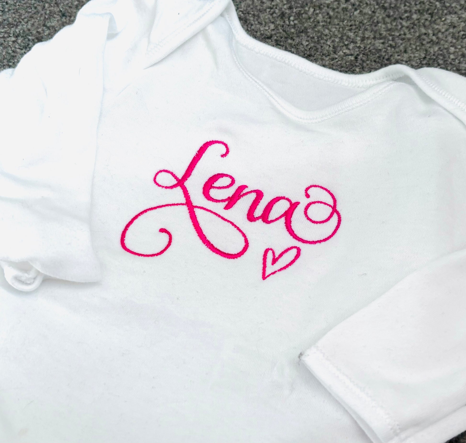 Personalise your baby's wardrobe with our Embroidered Script Name Baby Grow. Choose from a variety of thread colors and watch as your little one's name comes to life in a stunning script font. Made with high-quality materials and expert embroidery techniques, this unique piece is sure to impress.