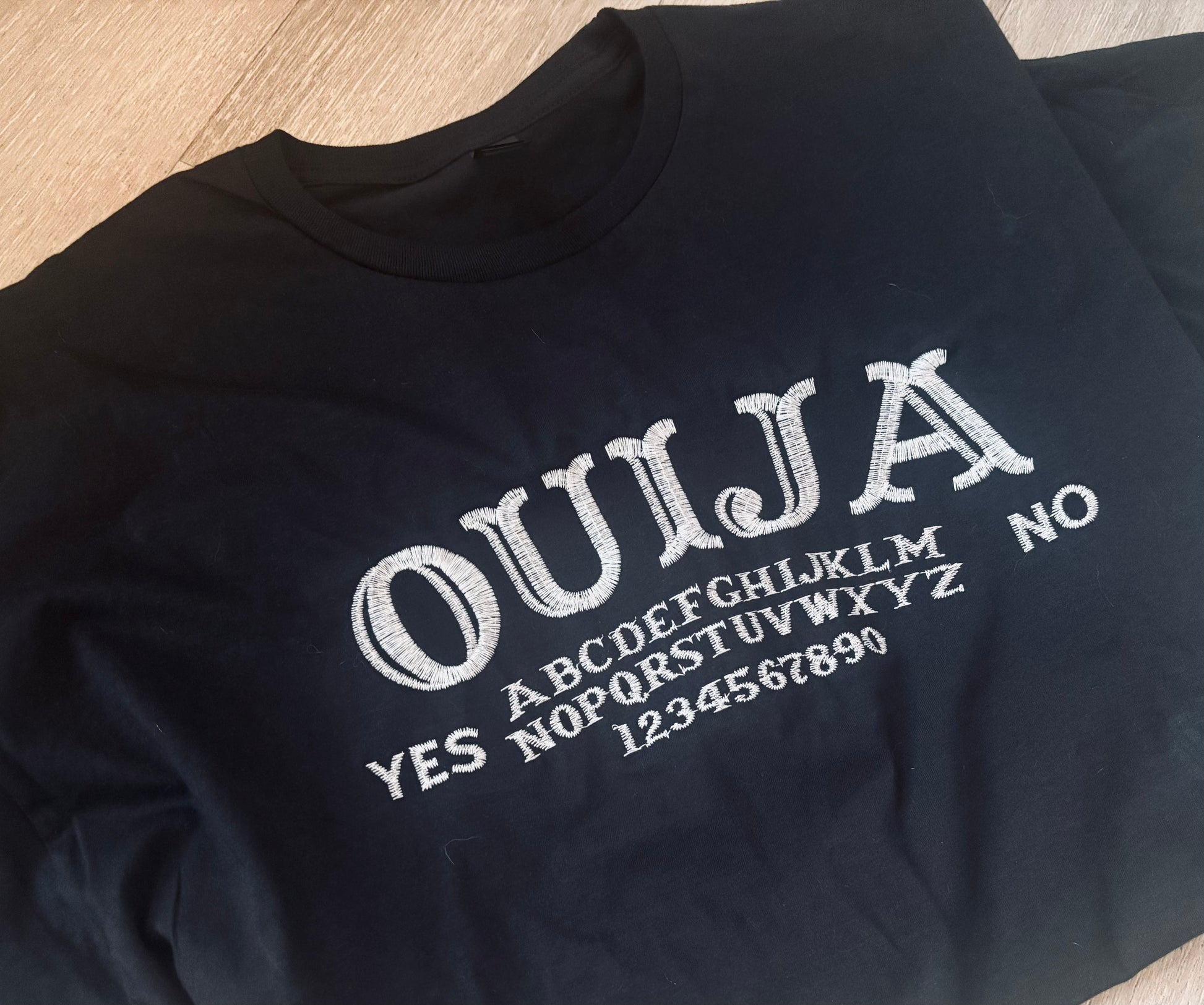 Summon up stylish spirits with our Ouija embroidered t-shirt. This quirky tee features a design inspired by the iconic Ouija board, making it a must-have for any supernatural fashionista. Communicate your unique style with this fun and fashionable piece.