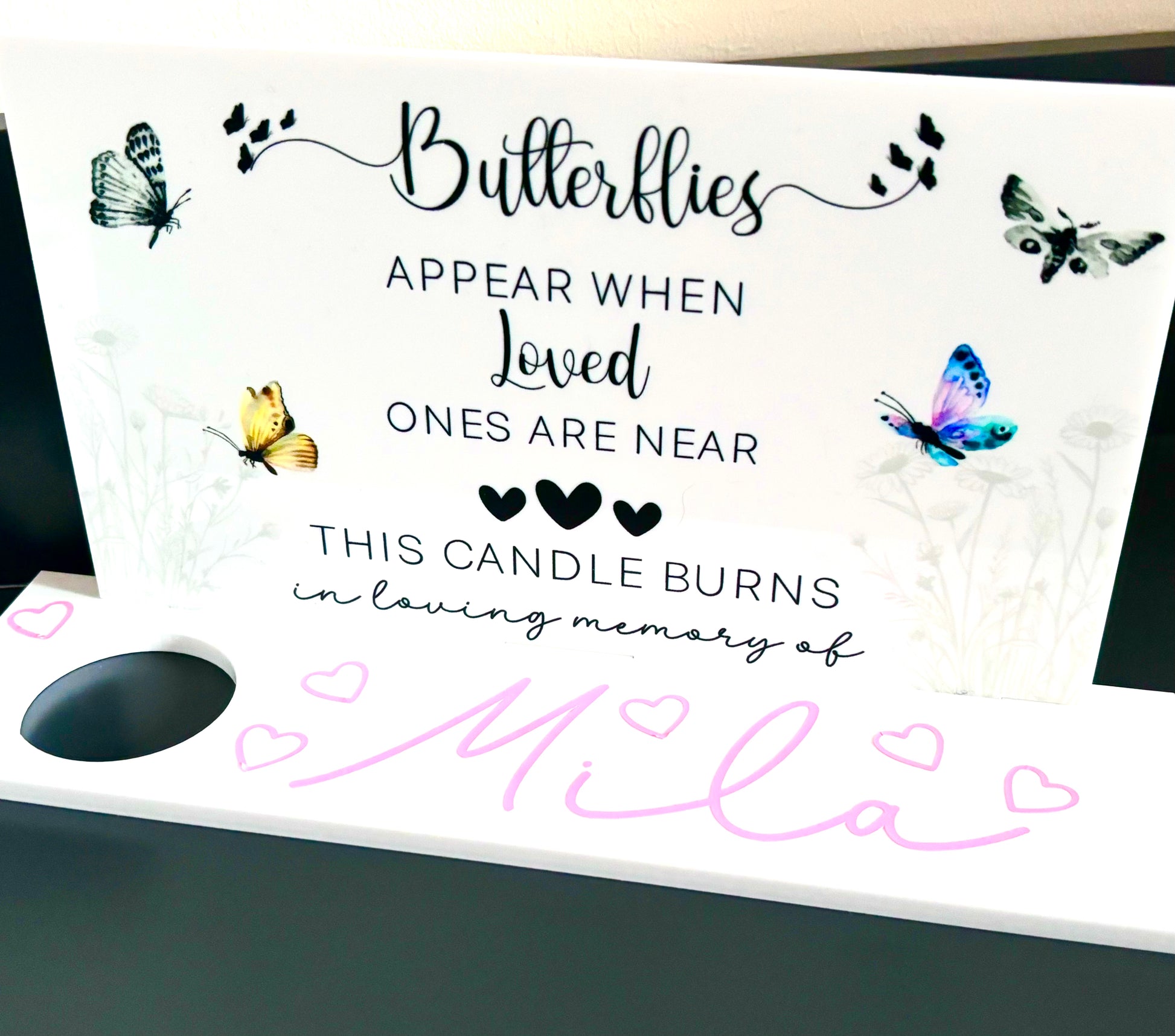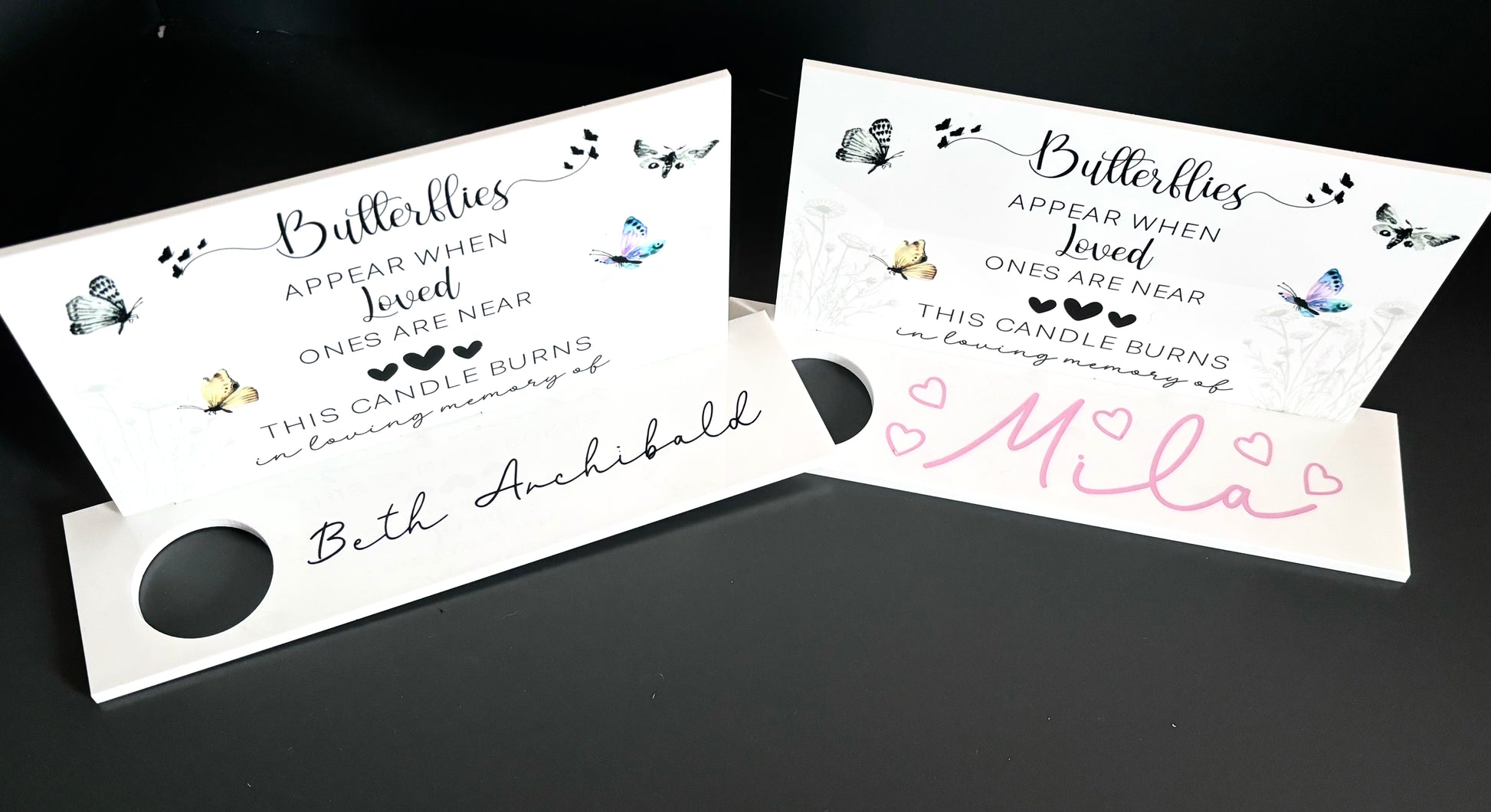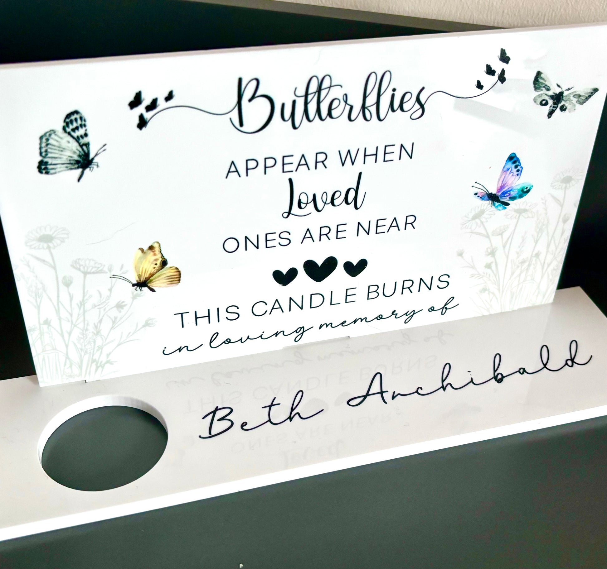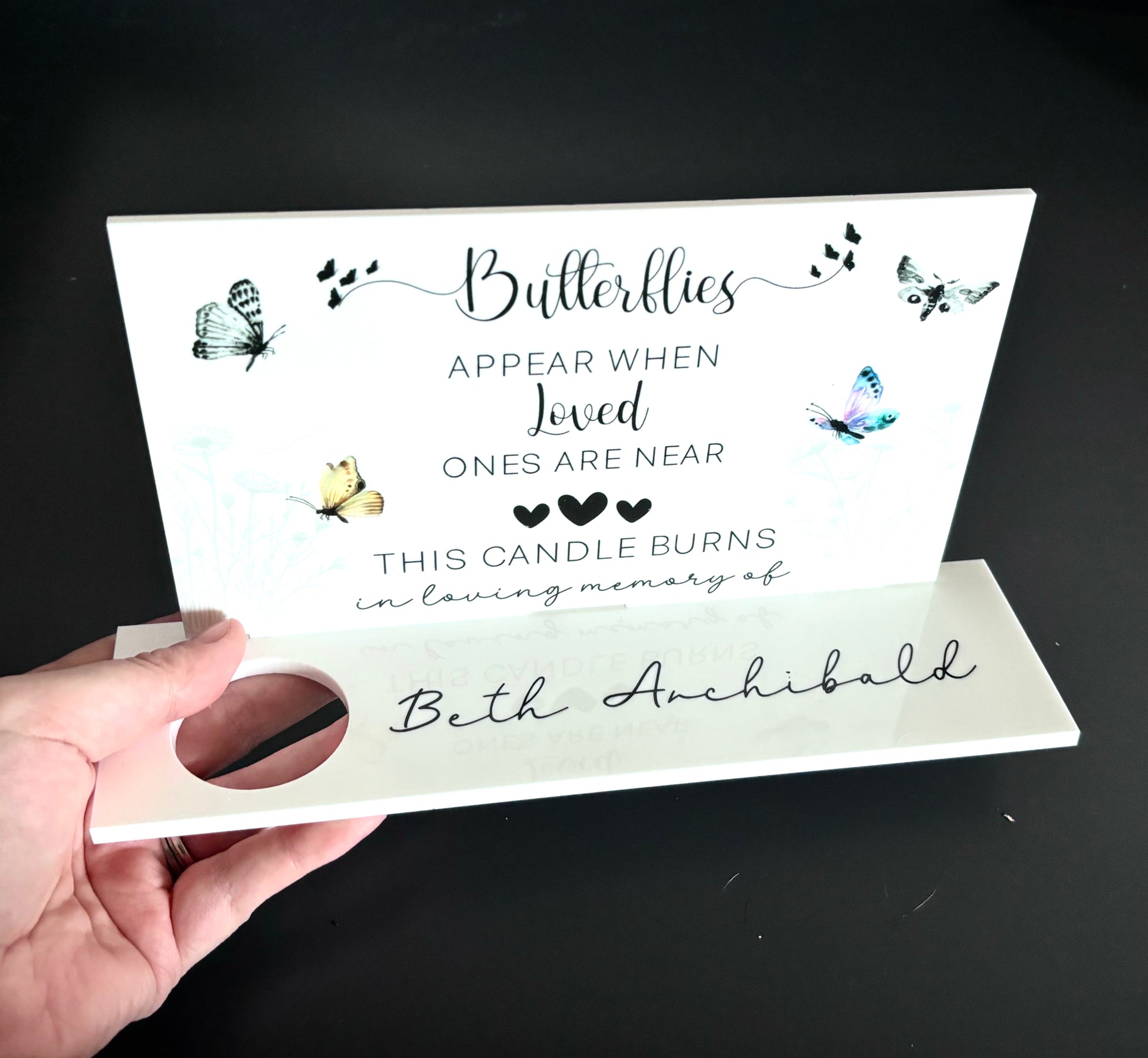Honour your loved one with our Personalised Butterfly Memorial Tealight Holder. Featuring a delicate butterfly design, this tealight holder serves as a heartfelt keepsake and a beautiful way to remember those who have passed. Handcrafted with love, it's a perfect way to honour their memory and keep their spirit alive. LED tea lights preferred