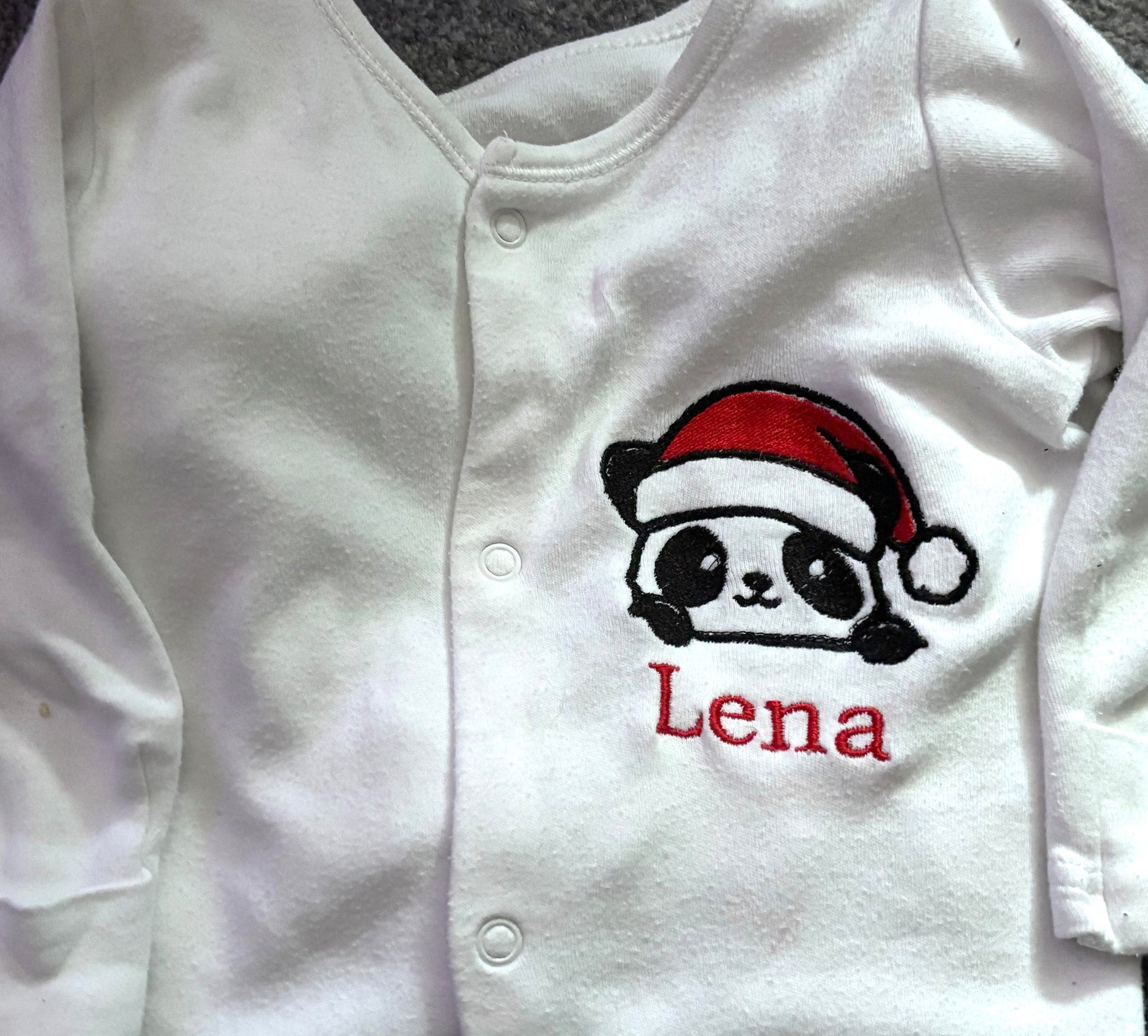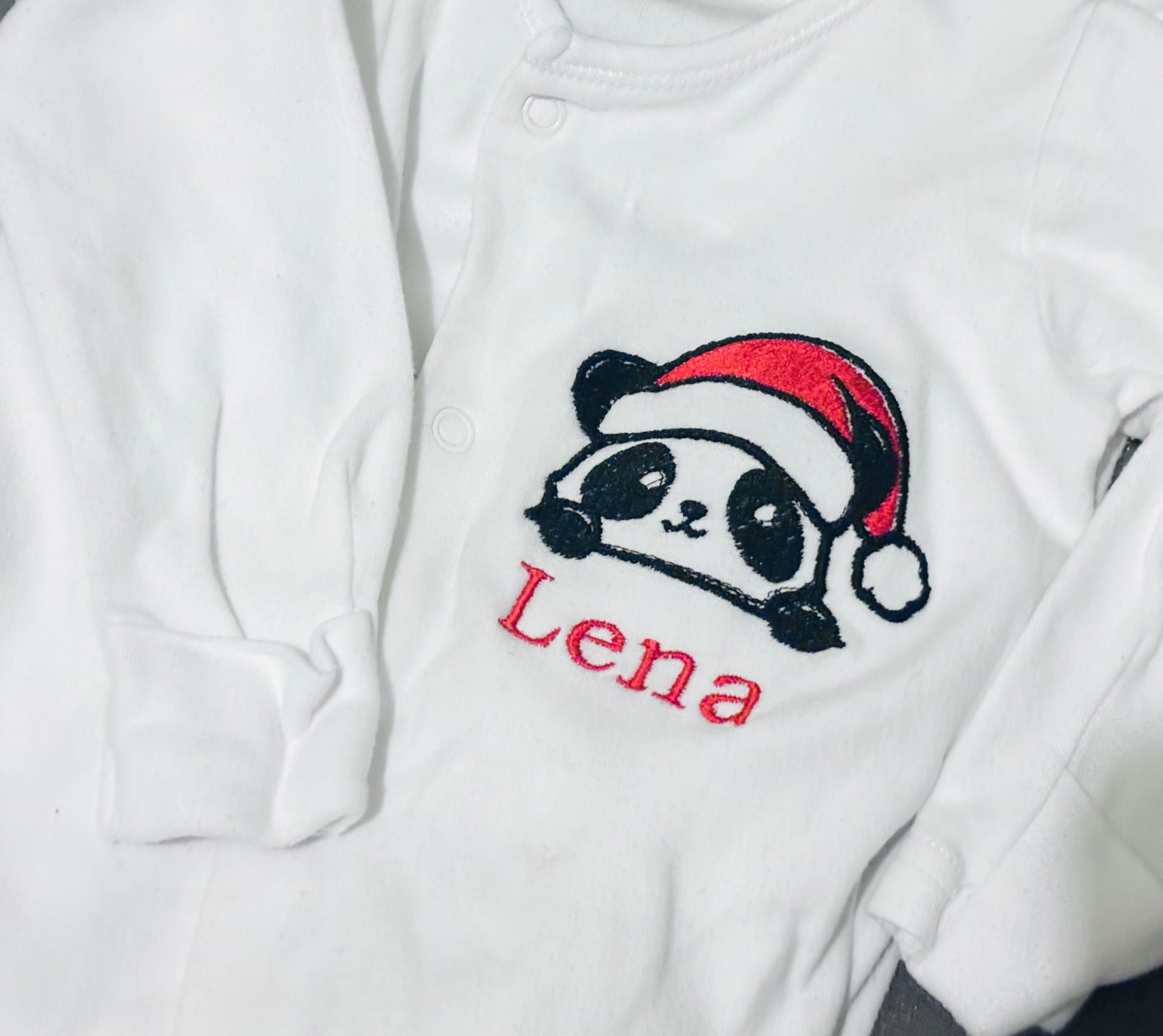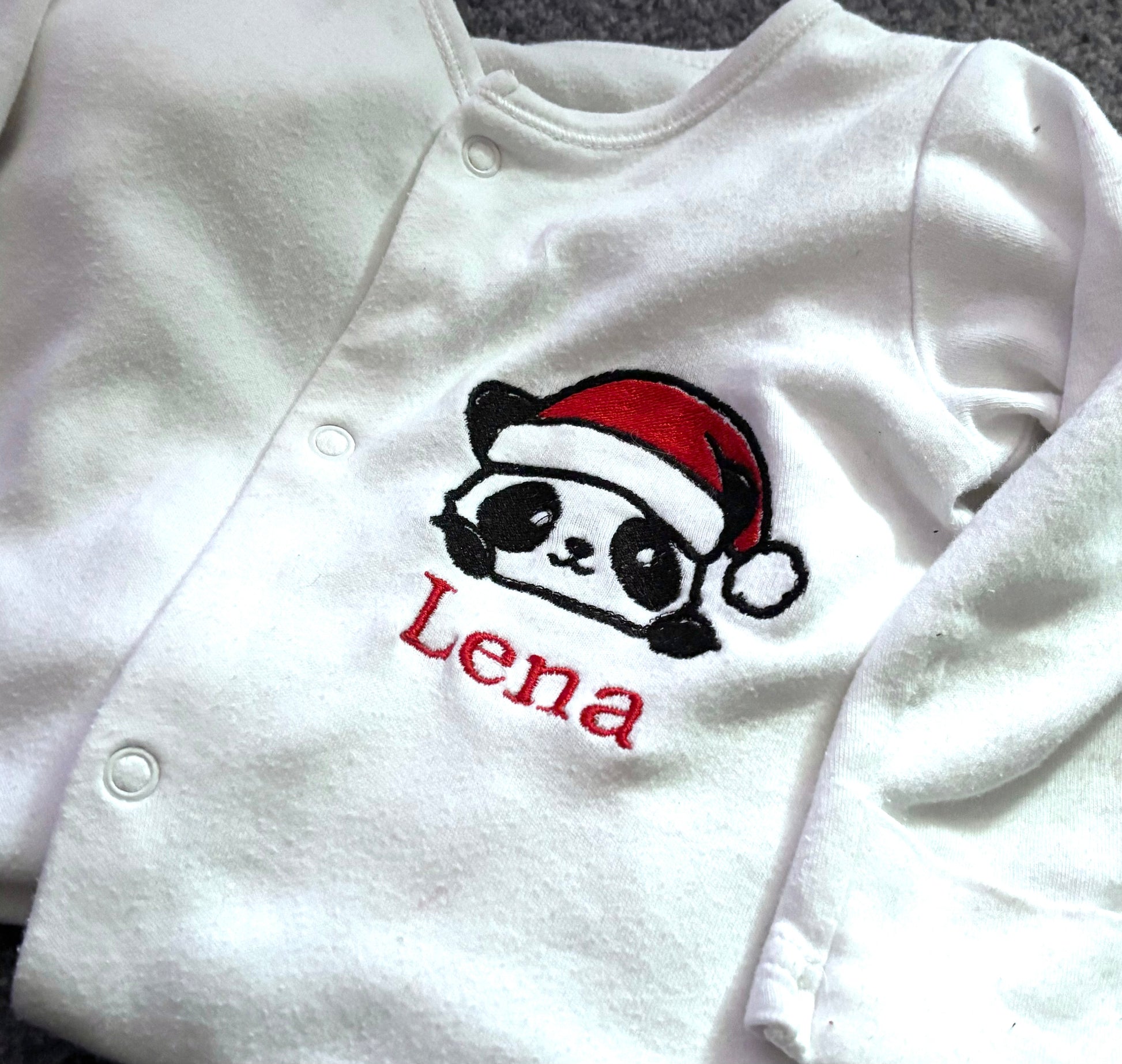 Get into the festive spirit with our Personalised Embroidered Panda Christmas Sleepsuit! This adorable sleepwear features a cute Christmas panda wearing a Santa hat, guaranteed to bring joy and warmth to your little one. Make it extra special with personalised embroidery. Order now for a festive and memorable Christmas!