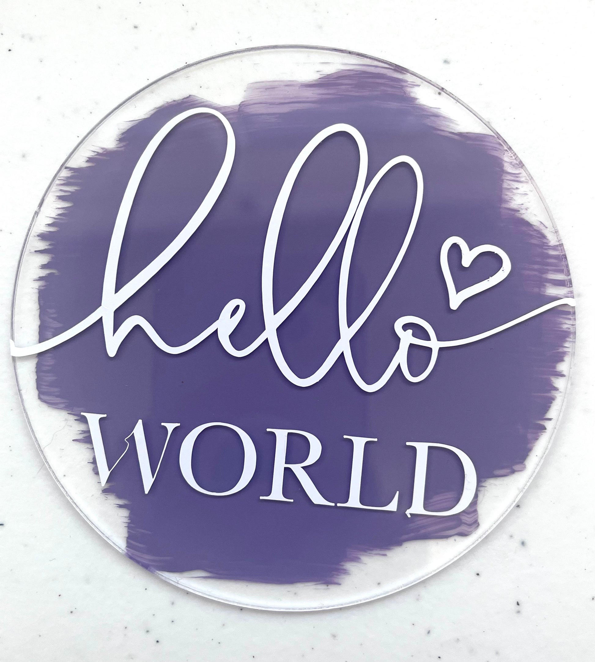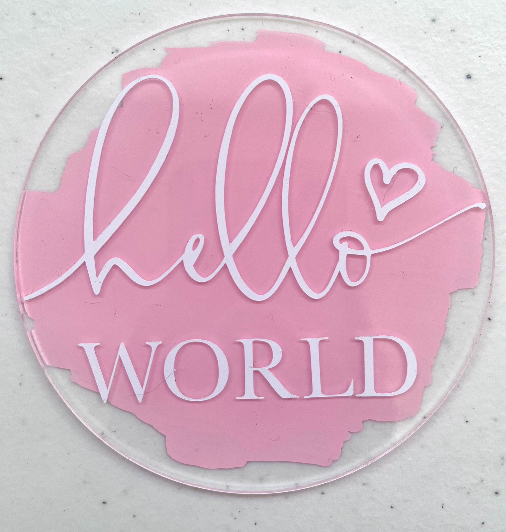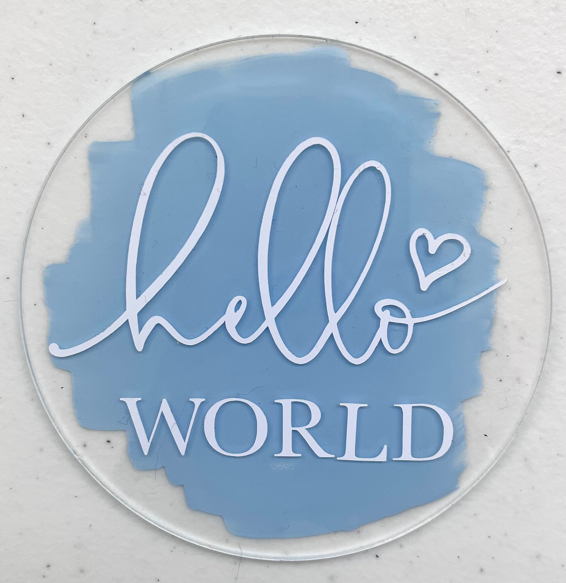 Personalised handmade milestone discs, either hello world disc only or full set. Totally customisable, have the name printed on one or all discs. More colours are available on request and text is printed white unless state otherwise. Paint splash is acrylic paint.